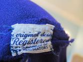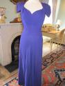 Descriptiona: Dress - purple crepe, heart shaped neckline, cap sleeves, back has small slit, bodice gathered to V-shaped yoke at waist in front, flared skirt full at bottom.