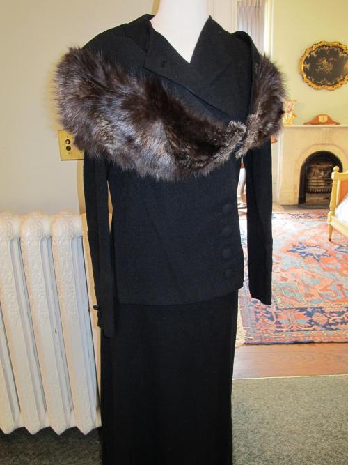 a: Jacket - fitted, closing with selt bound buttons on side, shawl collar with band of silver fox deep at centre back & narrowing to fronts, lined with black crepe-de-chine.