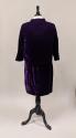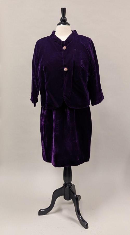 DescriptionPurple chiffon velvet sleeveless dress and boxy jacket; short length.