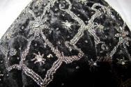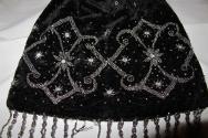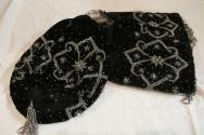 DescriptionBlack velvet misers purse, steel beading in diamond and scroll design, looped beaded fringe on one end and the other with velvet knob and bead tassel, grey satin lining.