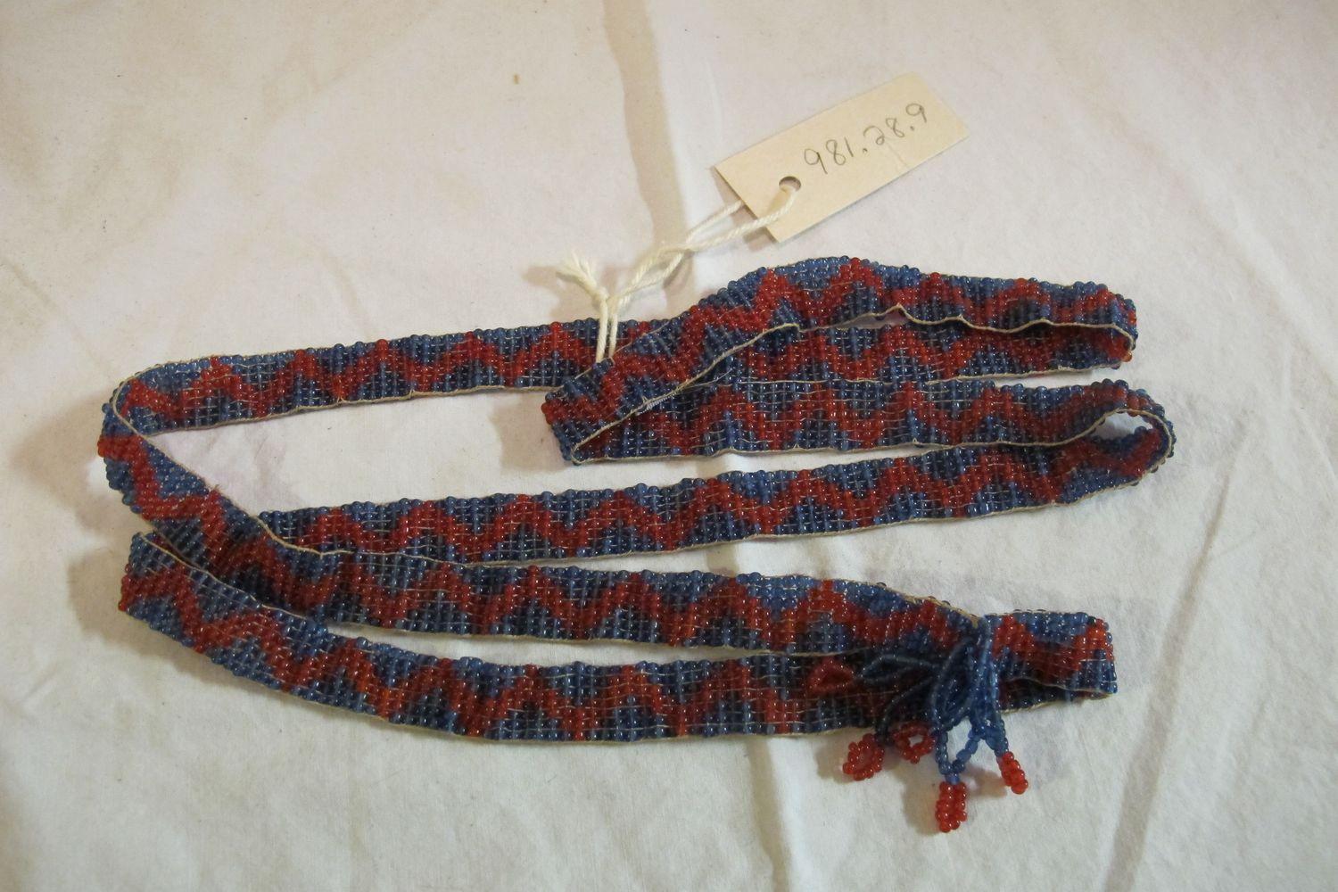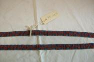 DescriptionBeaded narrow band joined with beaded tassels, pattern of chevrons in red beads on blue ground, blue looped tassels.