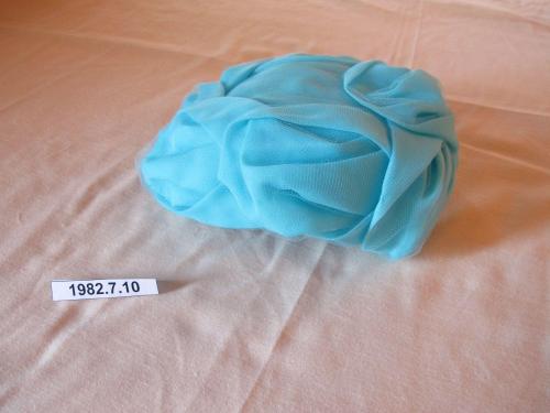 DescriptionTurquoise organza pillbox with shallow crown and loops of fabric around crown, covered with fine net, crown in 2 points down back and slightly cruved toward right front, hat pin, turquoise bead & pin.
