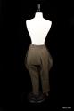 DescriptionDark khaki wool worsted jodhpurs; buttoned at sides on the diagonal from the waist; belt loops around waist; waist band of brown sateen with beige cotton pockets; sides curved outwards over hips; brown suede patches inside knee area; tight legs with turned up cuff at ankle; leather strap under foot.