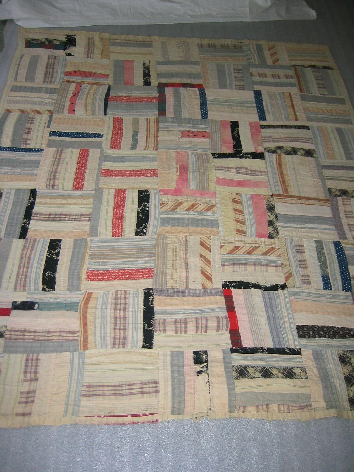 DescriptionPieced quilt, oblong strips of varied cottons, some ticking and shirting, pink dyed stockinette, roughly sewn together by hand, backing of green and white ticking, no padding.
