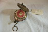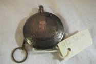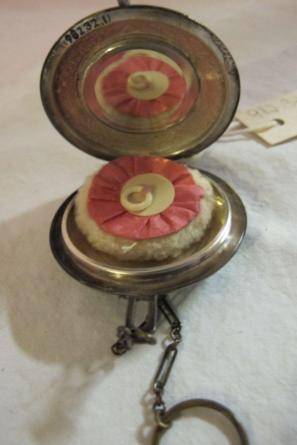 DescriptionSilver metal round compact on chain & ring, initial M in centre, floral pattern around sides, inside small round mirror, section for powder, puff of lambs wool.