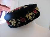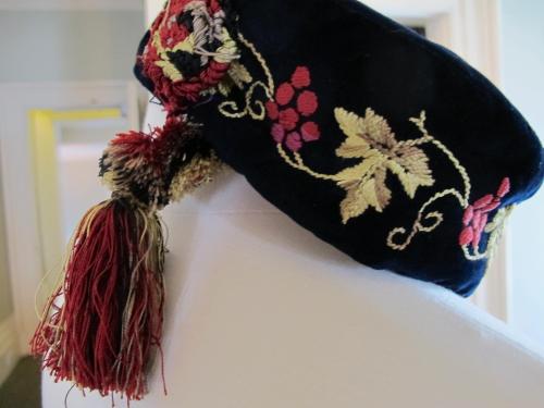 DescriptionDark navy velvet, round skull cap with Turkish influence, embroidered in D M C thread in colour of red, greens, gold, in grape vine pattern, centre back has silk button & tassle of same colours, cap lined with quilted shoe silk-maroon.