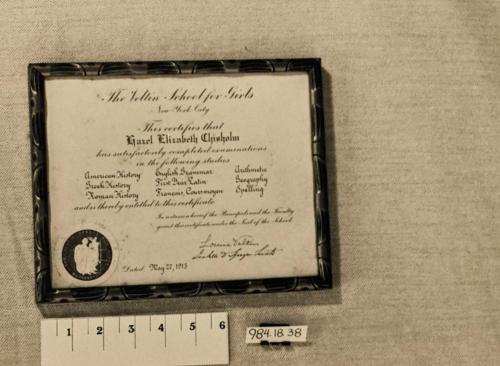 DescriptionWood framed certificate from the Veltin School for Girls, New York.