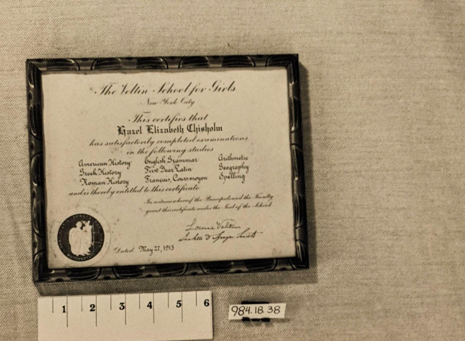 Label text:Awarded to "Hazel Elizabeth Chisholm" (Mathews) (1897-1978), "satisfactorily completed examinations" May 27, 1913