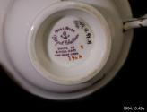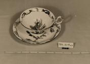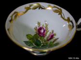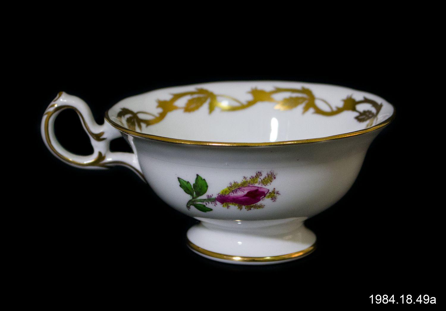 DescriptionA - Painted porcelain tea cup, Moss Rose pattern - red roses, green leaves, gold rim around cup edge and handle