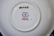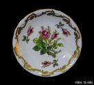 B - Saucer, gold leaf border and rim, red roses and green leaves in centre.