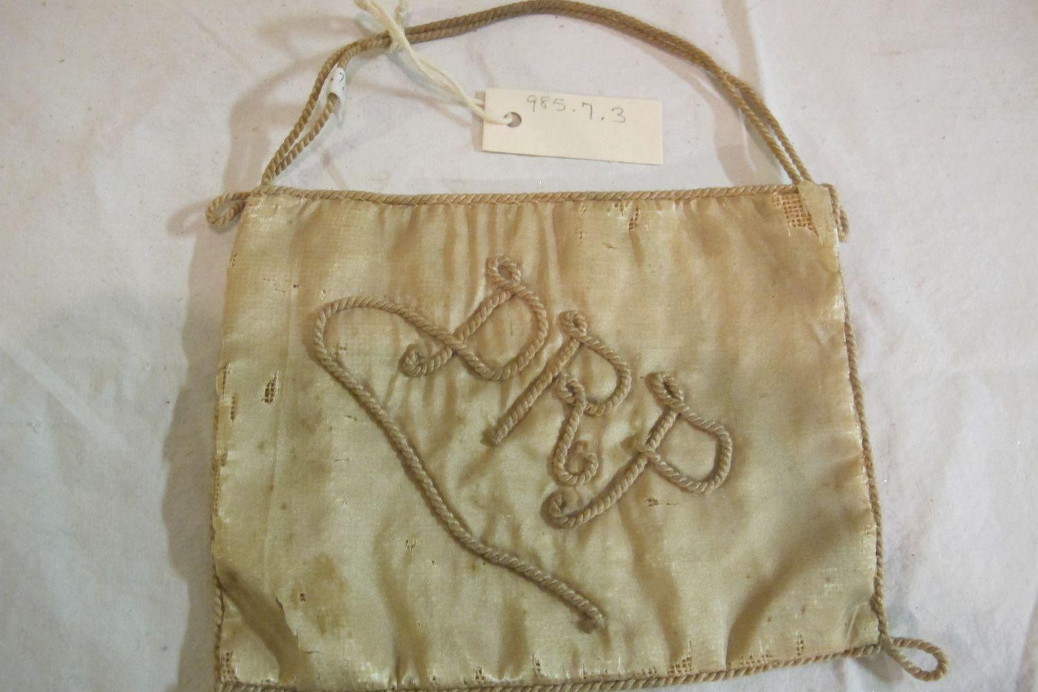 Beige silk purse with corded edges, handle and initials.