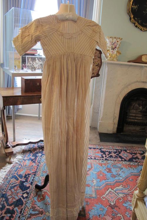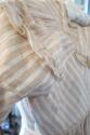 DescriptionBrown-white striped dress with high waist, short sleeved and ruffled bottom, 2 ties.