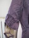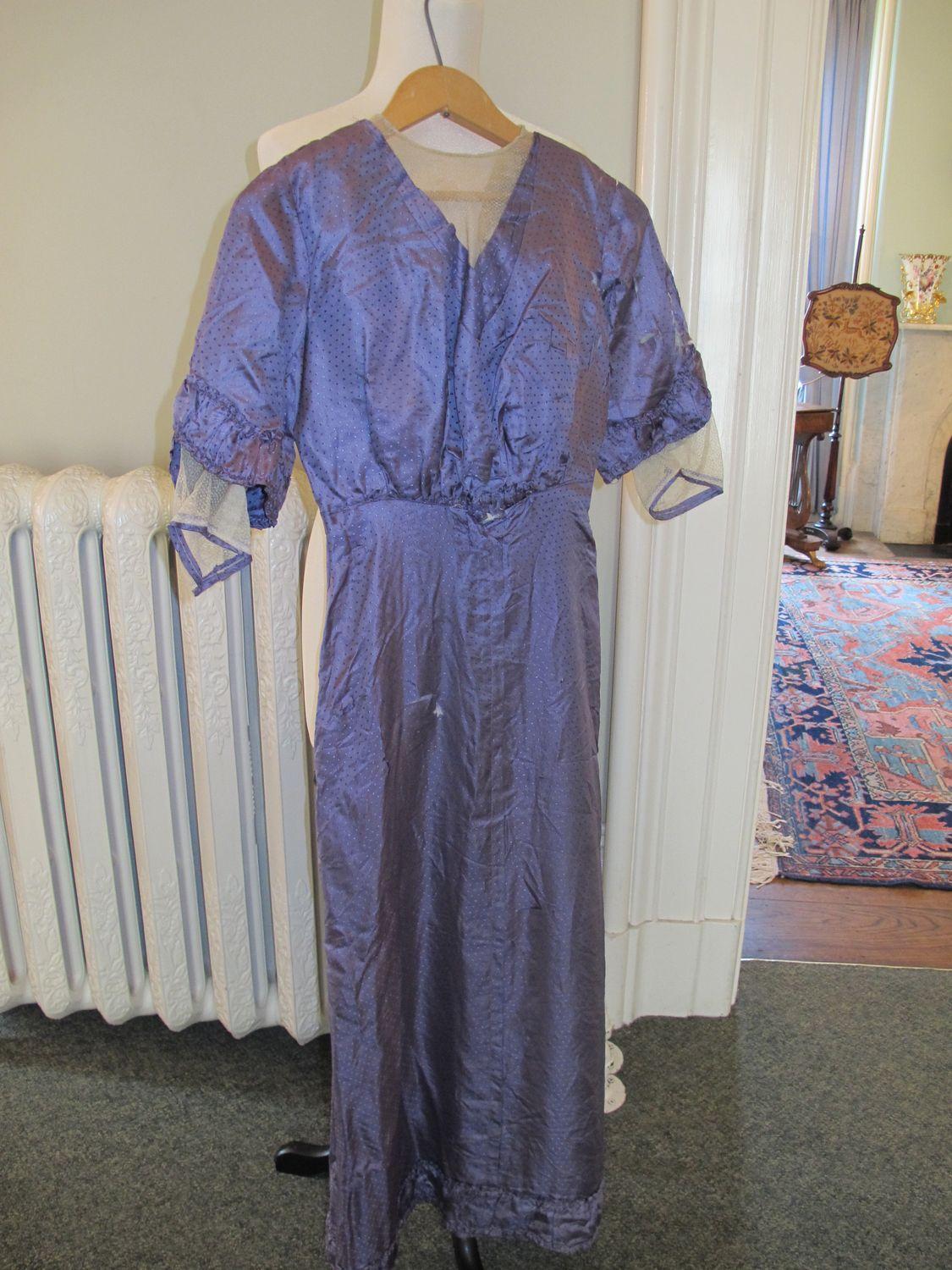 DescriptionPurple, lace, floor length dress, the sleeves are short with a ruffle and netting extending to below the elbow, the neck is in a v-shape with an insert of netting, the neck is waist of the bodice is gathered, the skirt is a fairly simple A-line skirt with a ruffle at the bottom, both the skirt and bodice close at the back with hooks and eyes.