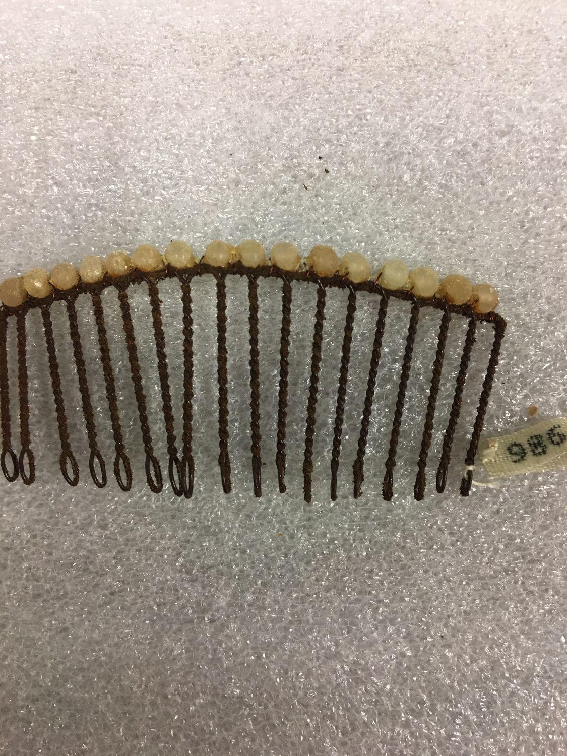 DescriptionHair comb with 16 costume pearls attached with glue and wire to 18 twisted wire teeth.