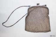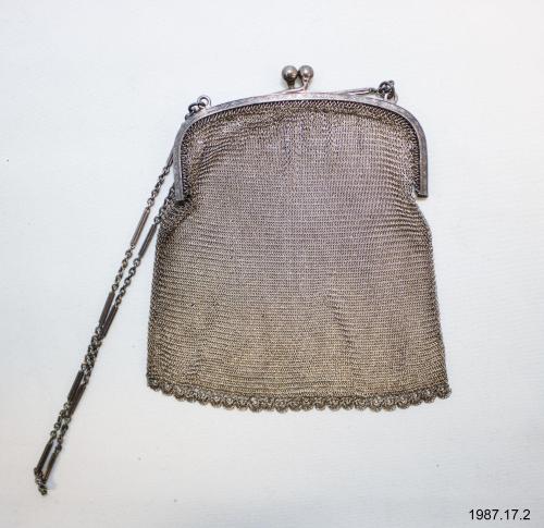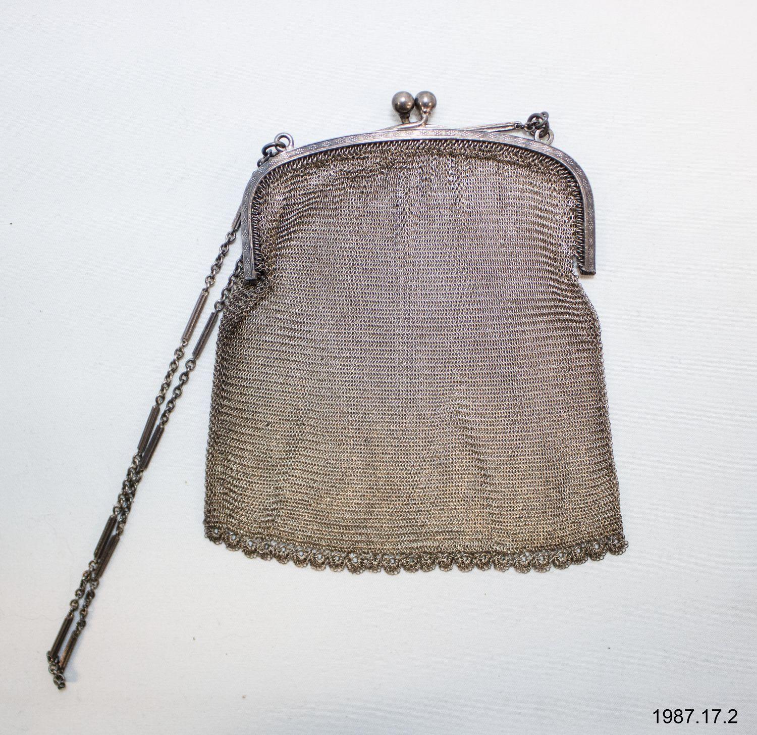 DescriptionSterling silver mesh purse, chain handle, two-knob clasp, chain handle attached to rim by round hooks, detailed etchings on rim, nine small diamonds patterned into a bigger one, scalloped bottom.