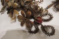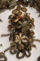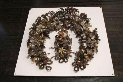 DescriptionHair wreath in wooden box frame, hair is woven on wire in the shapes of flowers, cloth on beads make up the middle of the flowers, frame is of reddish colour with gold trim right around glass, wreath is shaped like a horseshoe.