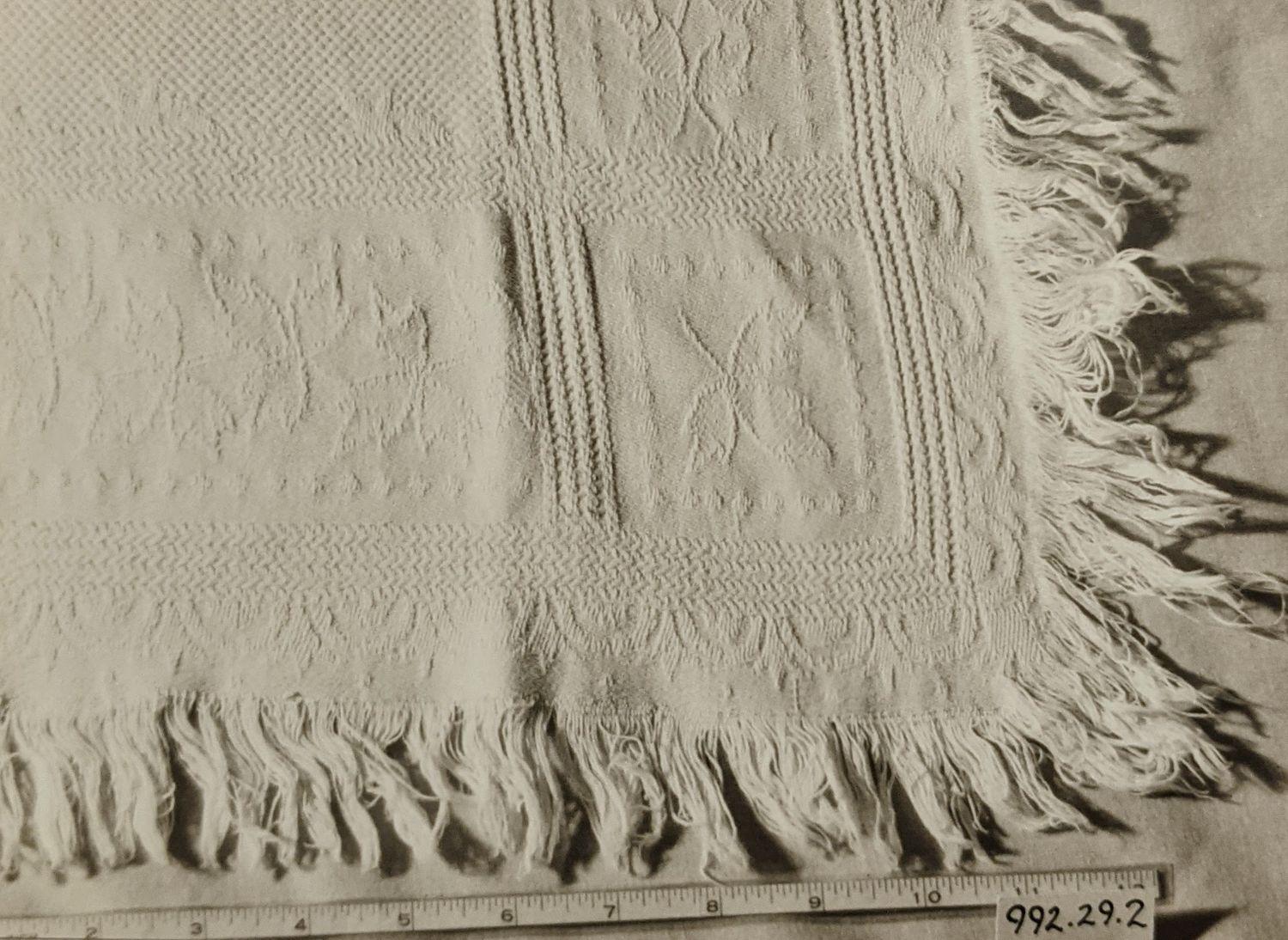 White damask patterned tablecloth with frayed edges.