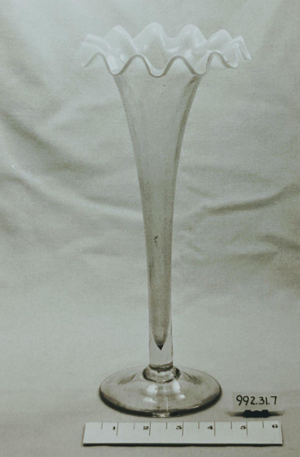 Victorian glass vase, trumpet shaped, green vaseline tinted glass.