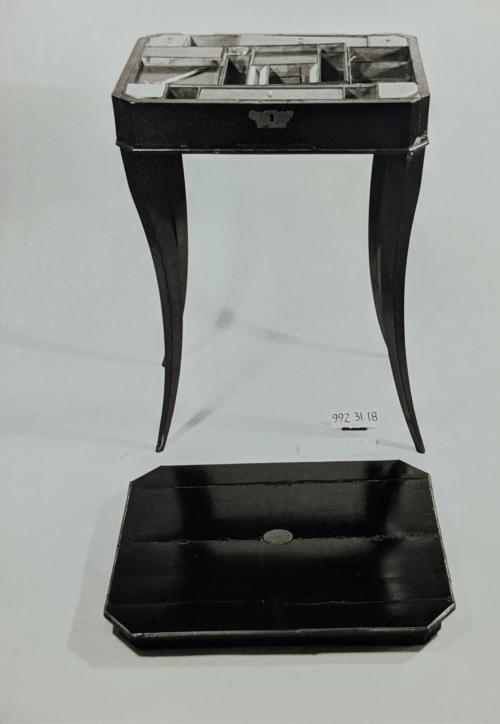 DescriptionBrass bound regency style lift top sewing table. Top insert with oval brass plaque inscribed "Matilde"