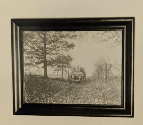 Framed photograph of men shooting from a car.