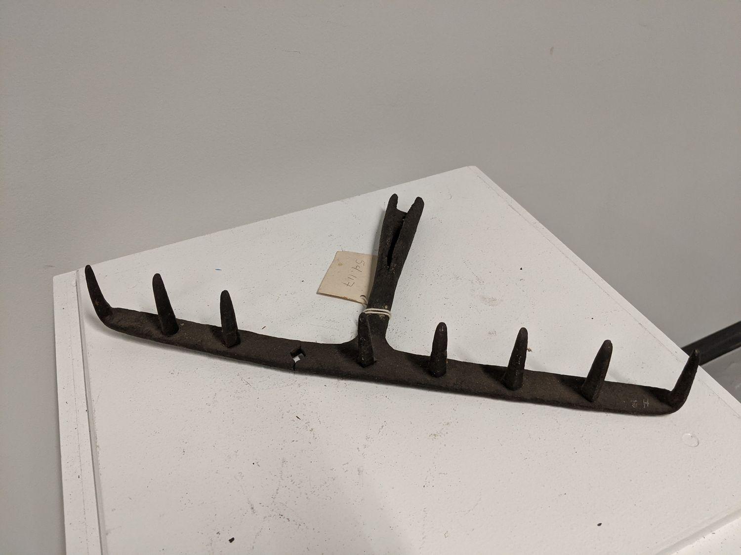 Label text:Marked on old card “Made by Ribble, blacksmith at Oakville. Found under floor at Murray House Hotel”
