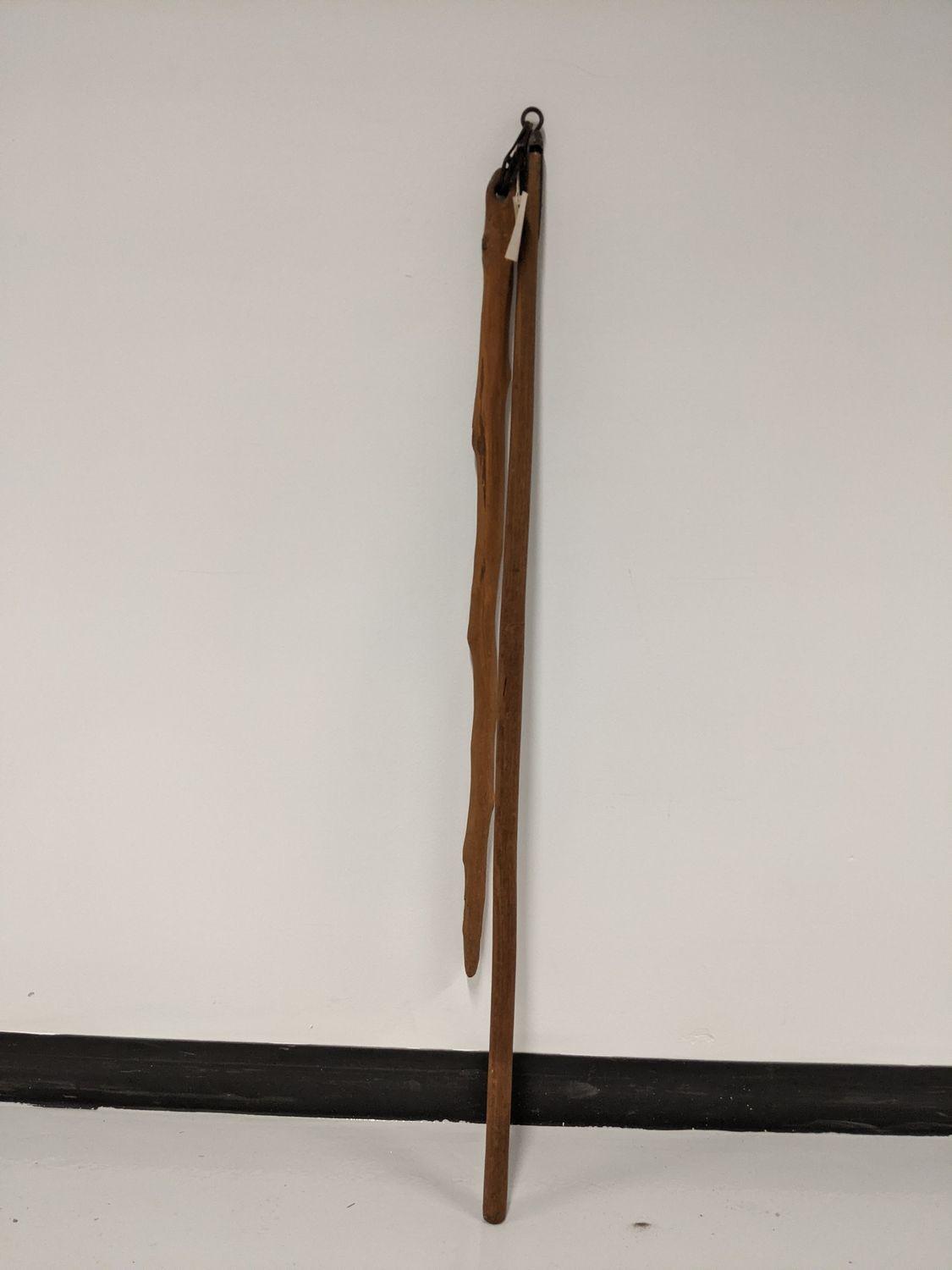DescriptionWooden with metal hinge, later type, used for thrashing grain.