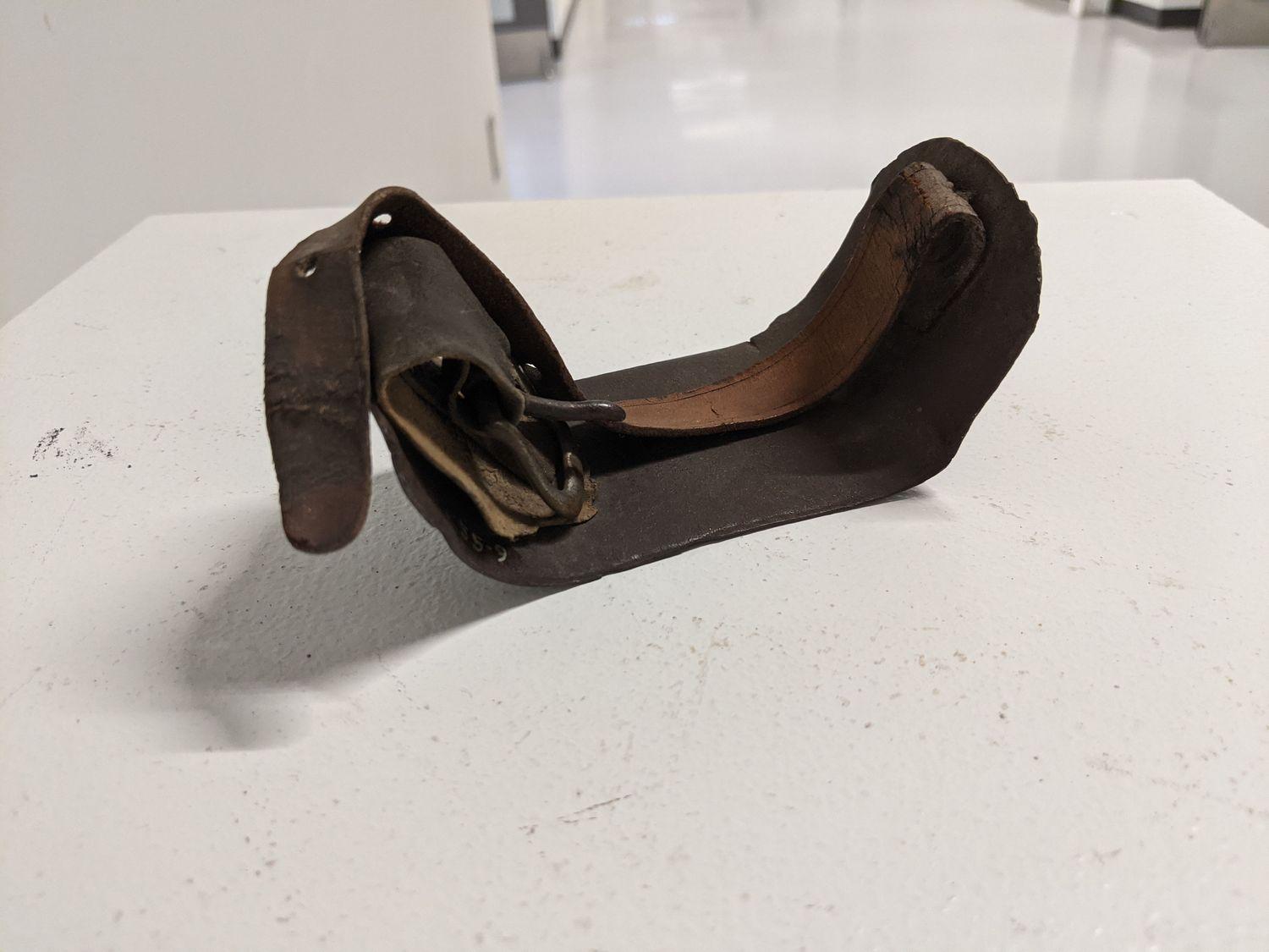 DescriptionSaddle for foot protection for use with digging, leather strap, metal buckle attached to bent iron plate bottom.