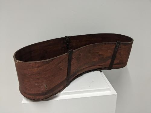 DescriptionWooden kidney-shaped box, stained red, metal brackets & nails hold bottom to sides, brackets also hold metal rings at top edge, handle on side.