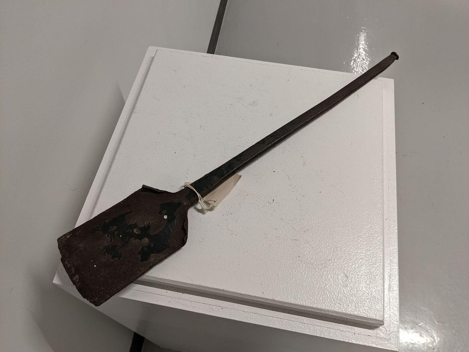 DescriptionCast iron slicker, similar to a small shovel except shovel part flat, was once painted green.