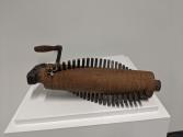 DescriptionCast iron cylinder breaks into 2 pieces, wooden roller inside with metal spikes, turned by handle with wooden grip, wooden plate inside holds blades to cut meat, wide opening in top.