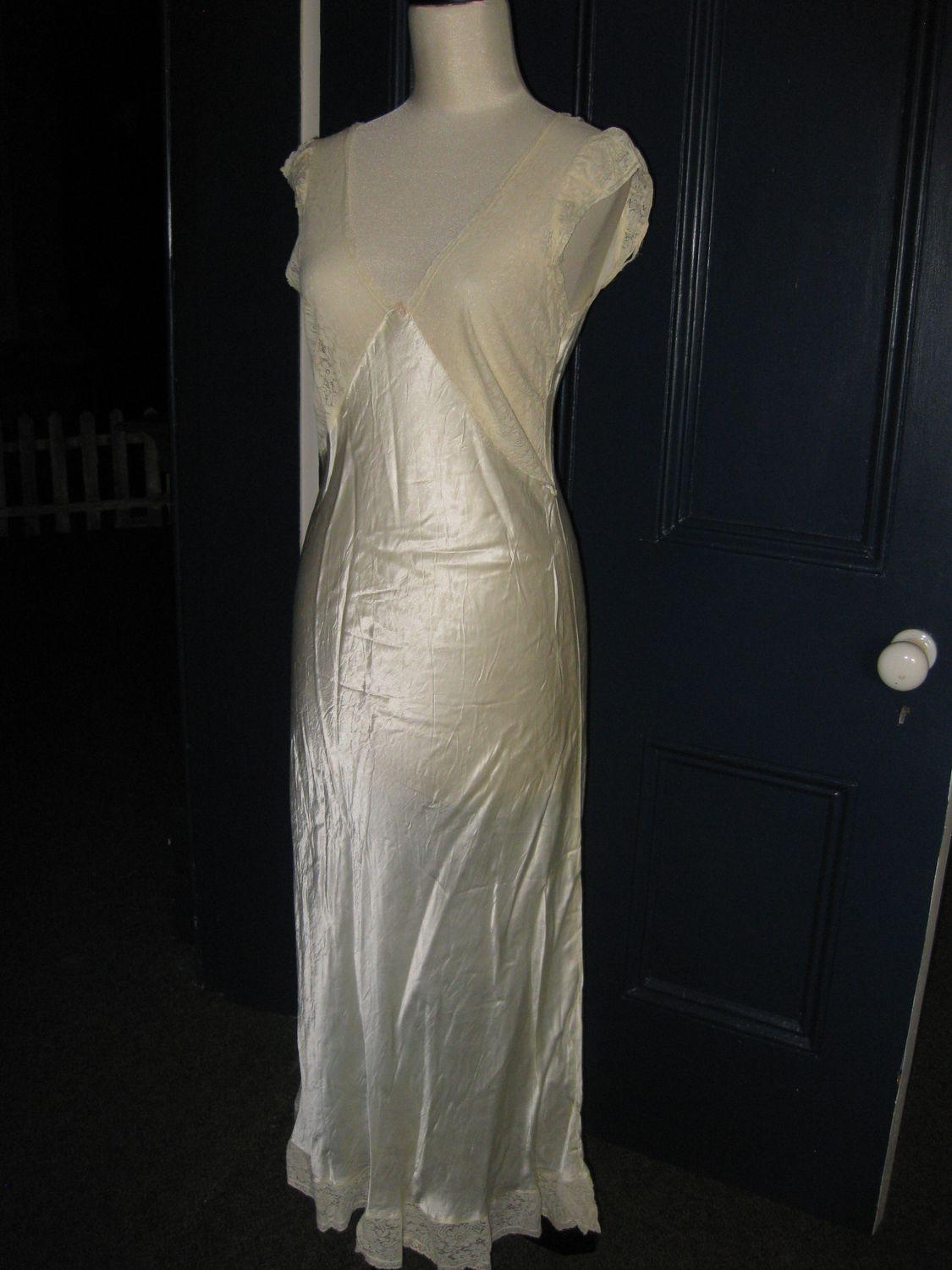 DescriptionCreme-coloured satin nightgown, bias cut, lace trim, and bra, pink and blue flower at centre of bra, small puff sleeve, label on insdie back as a V with a head and shoulders of a woman, lace is of stretchy material, white satin tab on one side.