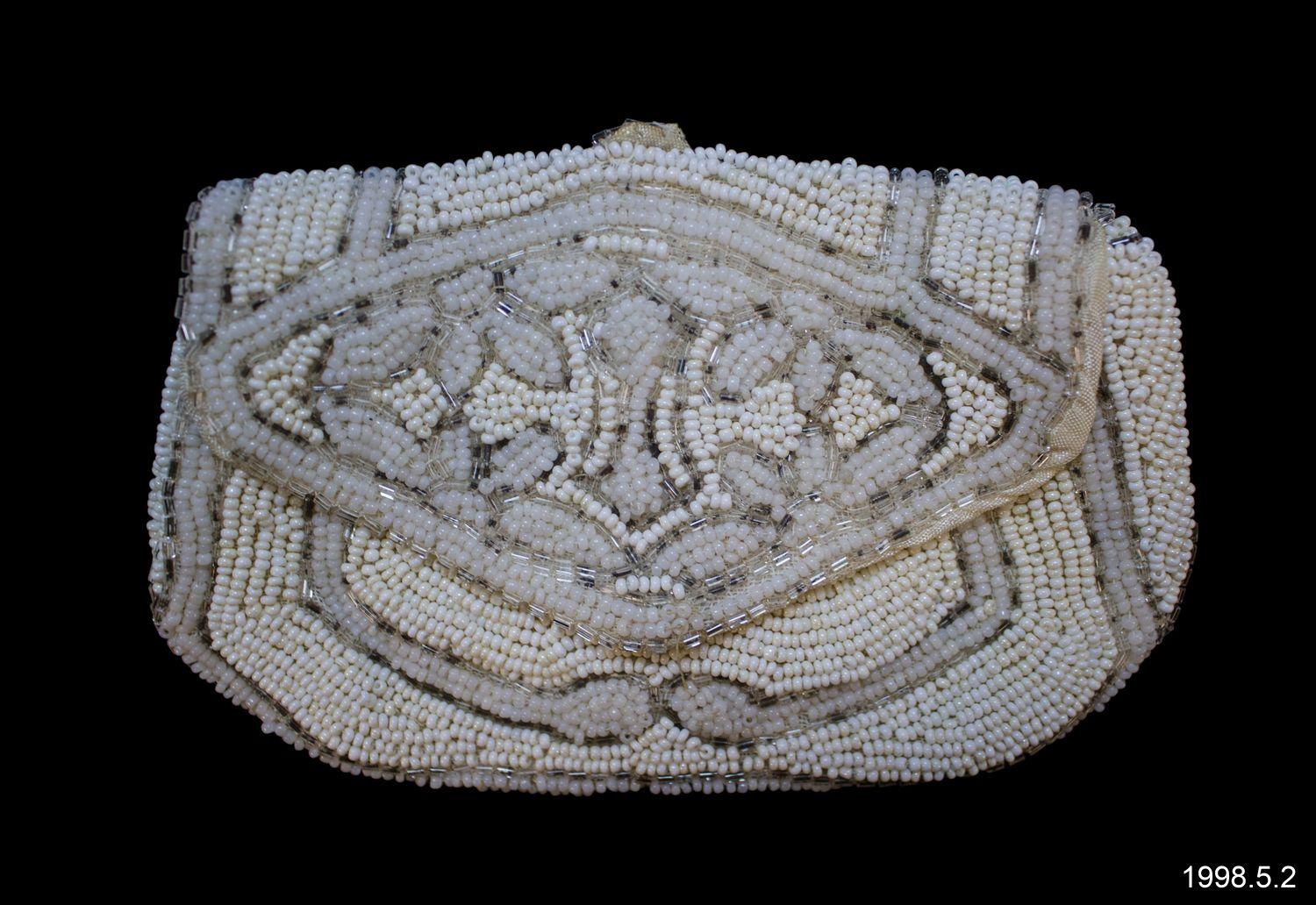 White beaded purse with beige floral bead design.