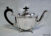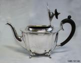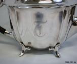 DescriptionFour piece silver tea service, each piece has monogram "T", teapot and coffeepot have ebony handles and knobs, on each side of the pieces are two decorative vertical rims.