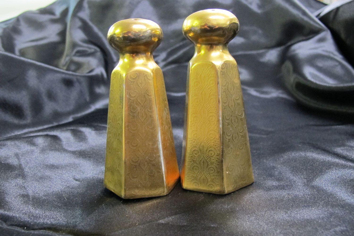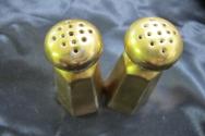 DescriptionSalt & pepper shakers, gold-plated, each has 13 holes on top, each has 6 sides, embossed design on all sides, cork stoppers.