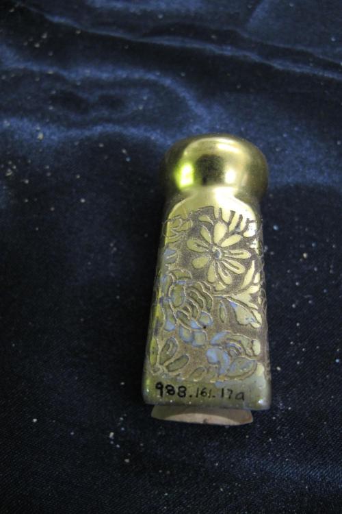 DescriptionVery small salt and pepper shakers, gold plating, each shaker has 13 holes to dispence, 4 sides each with raised flower design, cork stoppers.