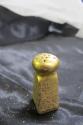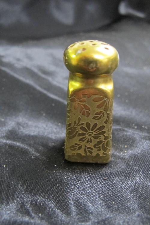 DescriptionVery small salt and pepper shakers, gold plated, each shaker has 13 holes to dispence, 4 sides each with raised flower design, cork stoppers.