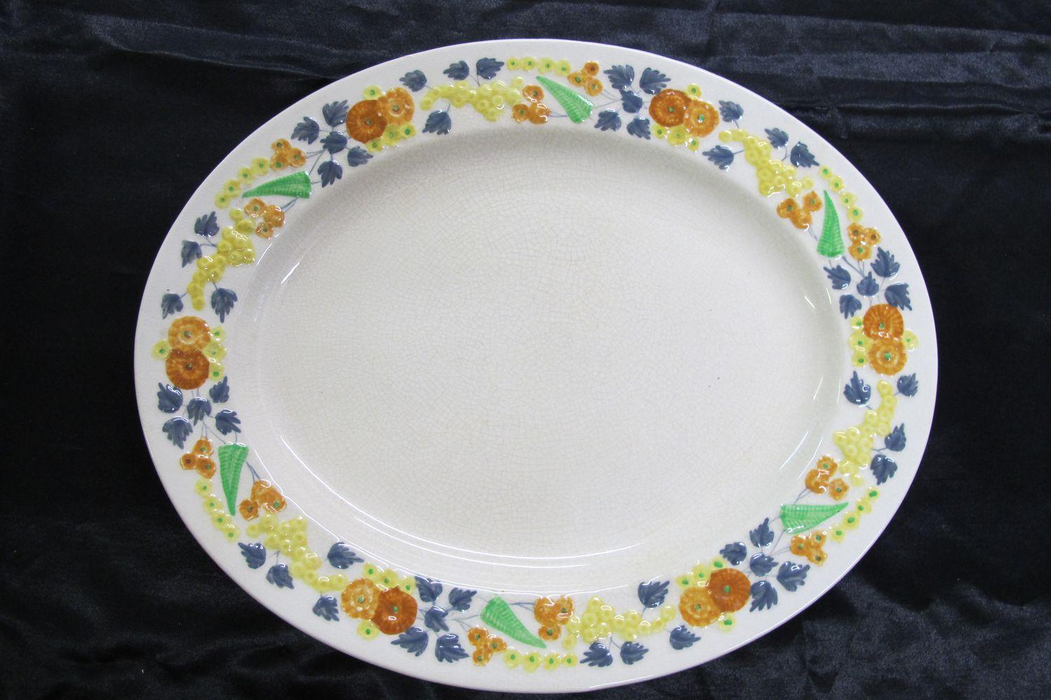 DescriptionOval platter, border has a relief design of many flowers of various colours including yellow, green, burnt orange and grey-blue.