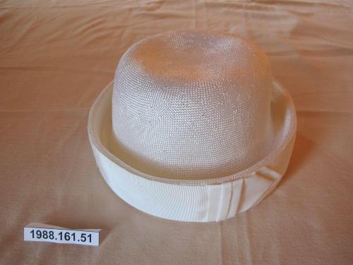 DescriptionLadies white canvas hat (possibly for summer), round but with a flat top, wide vertical brim covered by white gros-grain ribbon, addition of ribbon made to look like belt buckle with ribbon ending in 2 points, thin band of white grosgrain ribbon on inside.