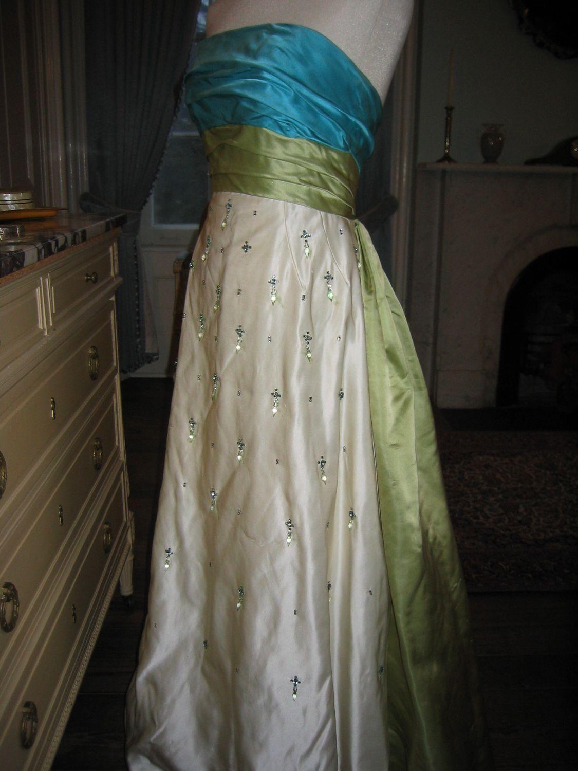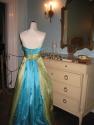 DescriptionFull-length ladies gown, strapless bandeau top of turquoise and green with white vertical panel down front of gown, white panel is decorated with various shaped beads, back features, 2 panels of green and a centre panel of blue, makers tag on inside of crinolin.