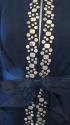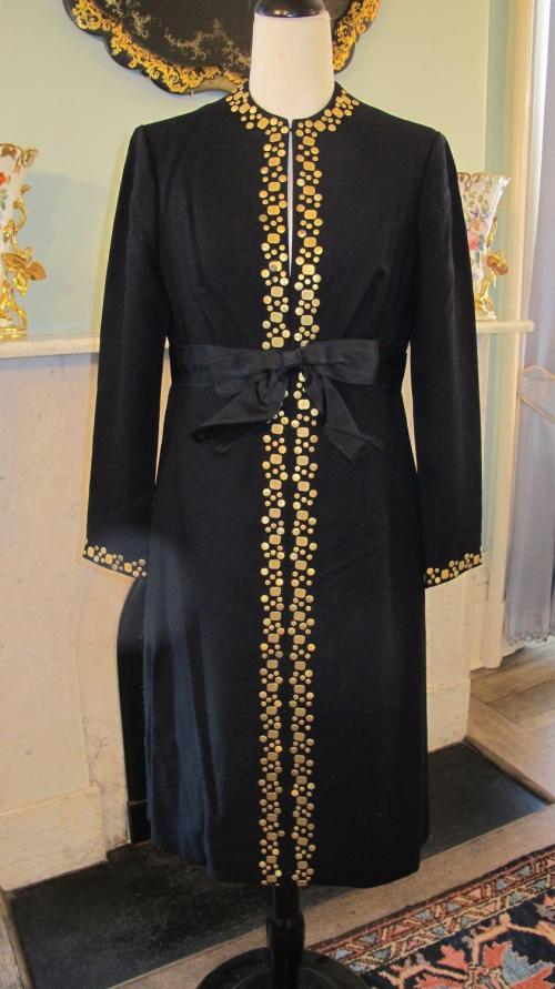 DescriptionLadies black wool dress with gold circular "buttons" bordering round neckline, key-hole slit and down front of dress in a linear row; same detail around cuffs; black ribbon belt with bow at centre waist.