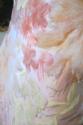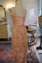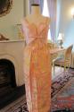 DescriptionLadies full length evening dress, pink bodice with 1 inch straps and bow, dress falls loosely from bust, pink silk with burshed silk yellow, pink and orange flowers.