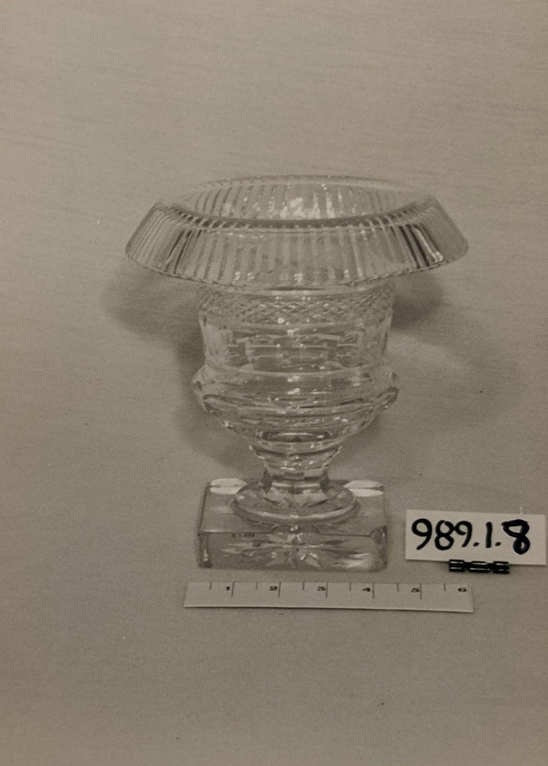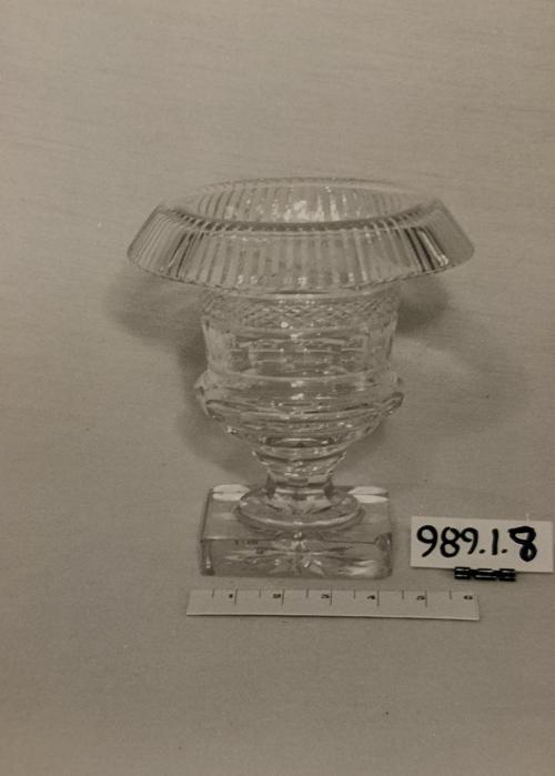 DescriptionHeavy urn-shaped crystal vase, hobnail and thumbprint design at centre of body, on square pedestal base, inverted rim with engraved ridges