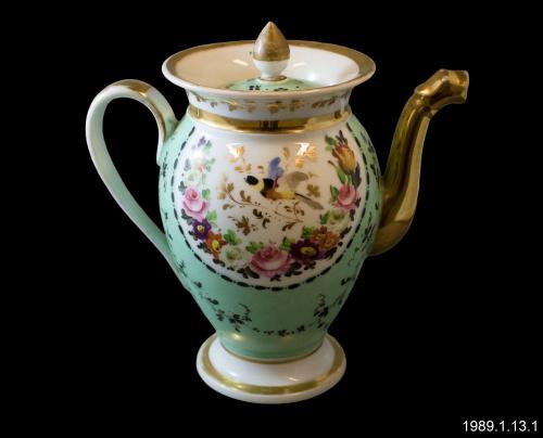 DescriptionA,B Coffeepot with lid, body is mostly light green with floral and fauna decorations, gilt handle, spout and banding; lid is green with black dots, gilt knob and banding, hole in lid.