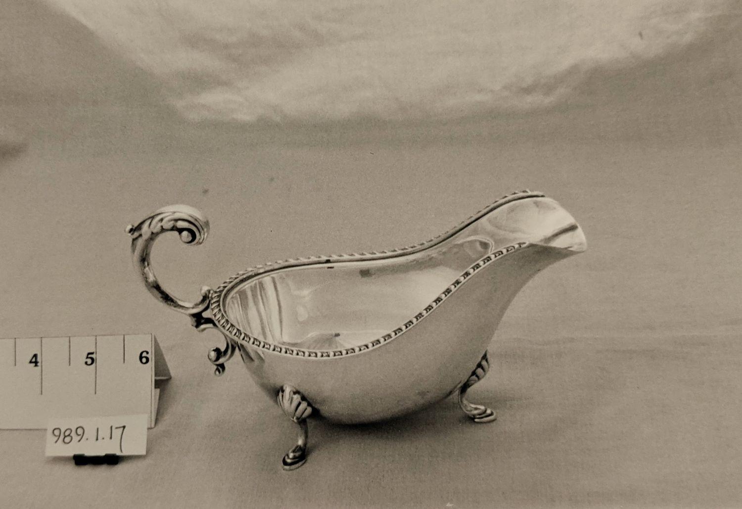 Label text:Chippendale design gravy boat. Manufactured by Birks. Belonged to Juliet Chisholm (1902-1964)