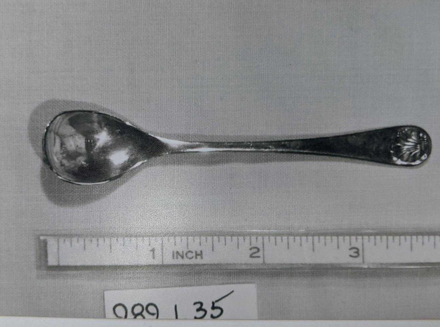 Silverplate mustard spoon, with shell mount, rounded shape.