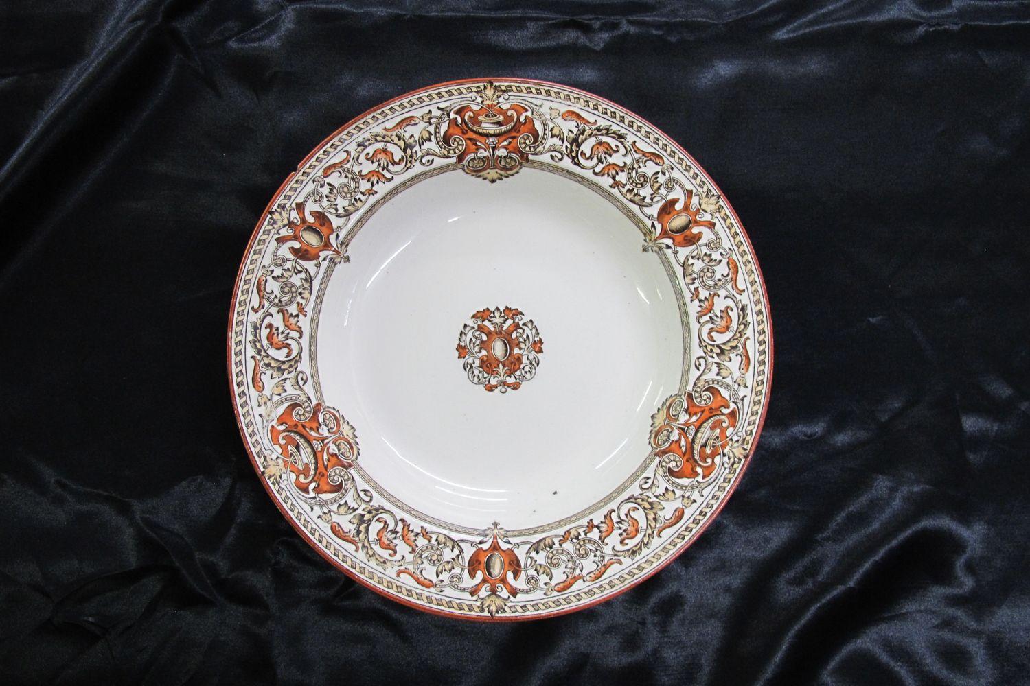 Set of 8 soup plates, "Beauvais Doulton", ornate ogee border in burnt orange colour, small design in centre of plate.
