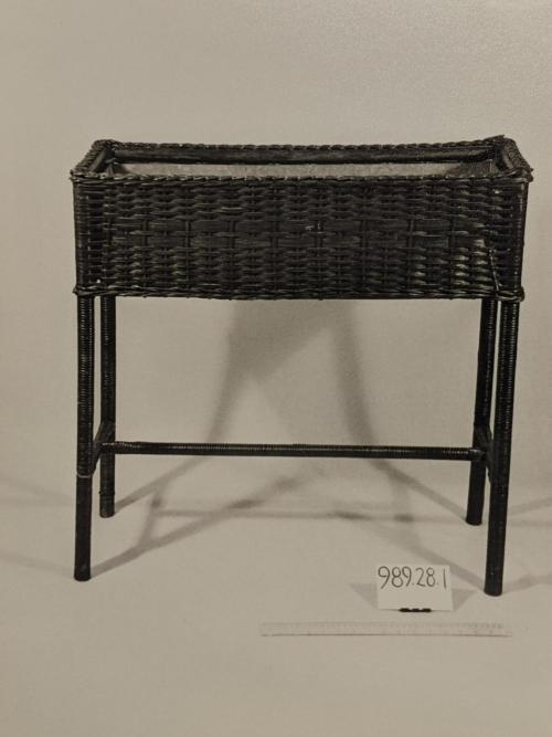 DescriptionPlant stand, rectangular with 4 legs, made of wood with a wicker weaving pattern on the wood frame, inside the rectangular box is a metal (steel) box (same rectangular shape), around the wooden legs, the wicker is wrapped around the full length.
