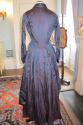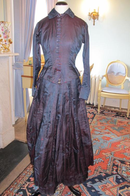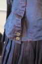 Deep turquoise-teal material with purple sheen collared dress, long sleeves, pleated bottom skirt, buttons up front.