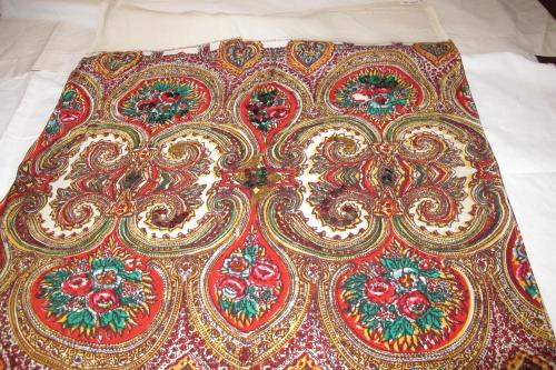 Rectangular scarf with red, green, yellow scroll designs decorated with red and gold sequins.