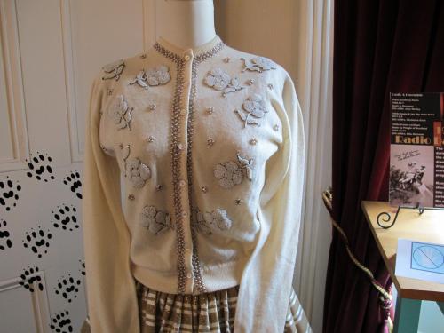 Label text:This sweater belonged to Etta Sherman and may have been worn at events she attended with the Women's Auxiliary, Alpha Omega Fraternity or the Canadian Friends, Hebrew University.